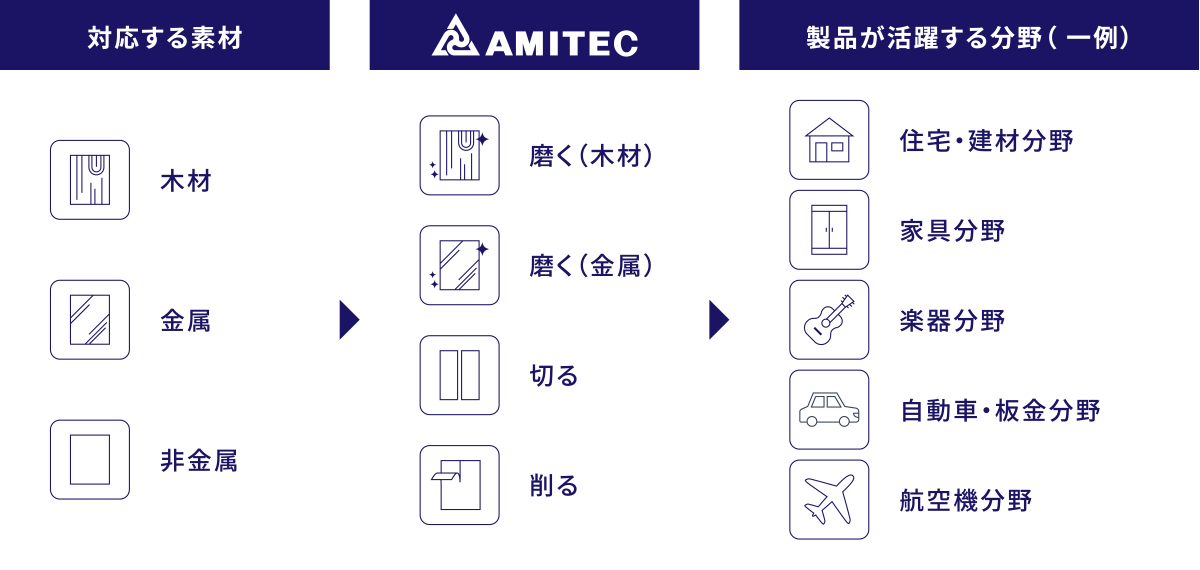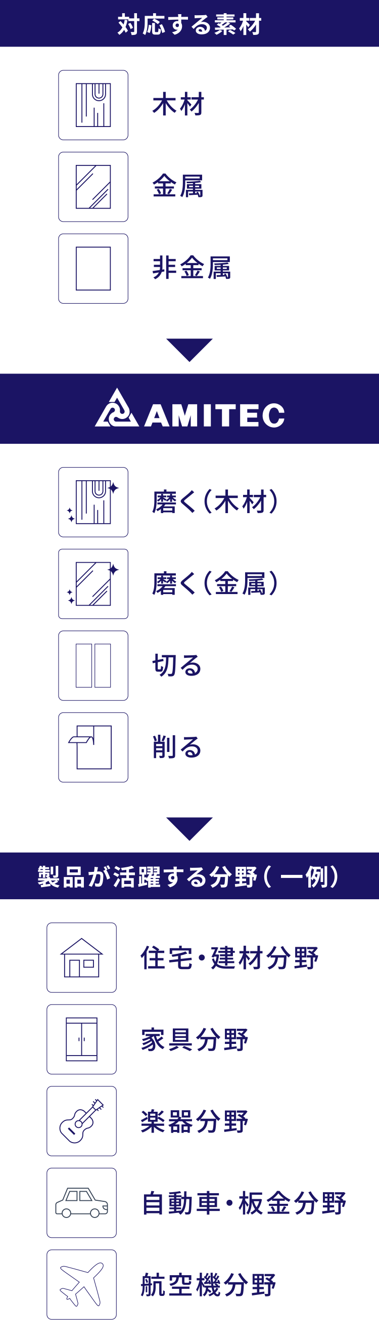AMITEC wide range product line is based on milling, sanding and cutting of wood matrials and extending to the machinery for metal/non-metal materials. Many customers appreciate that AMITEC provides high machining accuracy and technical advice in response even to very special custom requirements. Wide Belt Sander, one of the major products, has successfully taken top market share in domestic furniture industry.